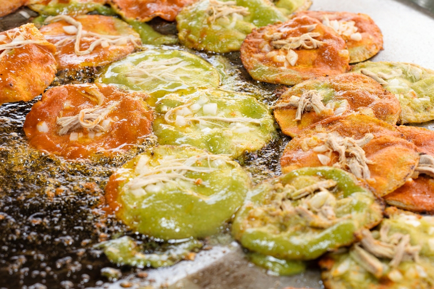 Chalupas are particularly popular in the states of Hidalgo, Puebla, Guerrero, and Oaxaca. In Puebla, chalupas are small, thick, boat-shaped fried masa topped with salsa, cheese, and shredded lettuce. It’s said that monks in Puebla invented chalupas by mixing chicken with dough and adding sauce and onions to enhance flavour. In Hidalgo, they are made with flat fried corn tortillas topped with green chili sauce, potato purée, white cheese, pulled chicken, lettuce, and radish.